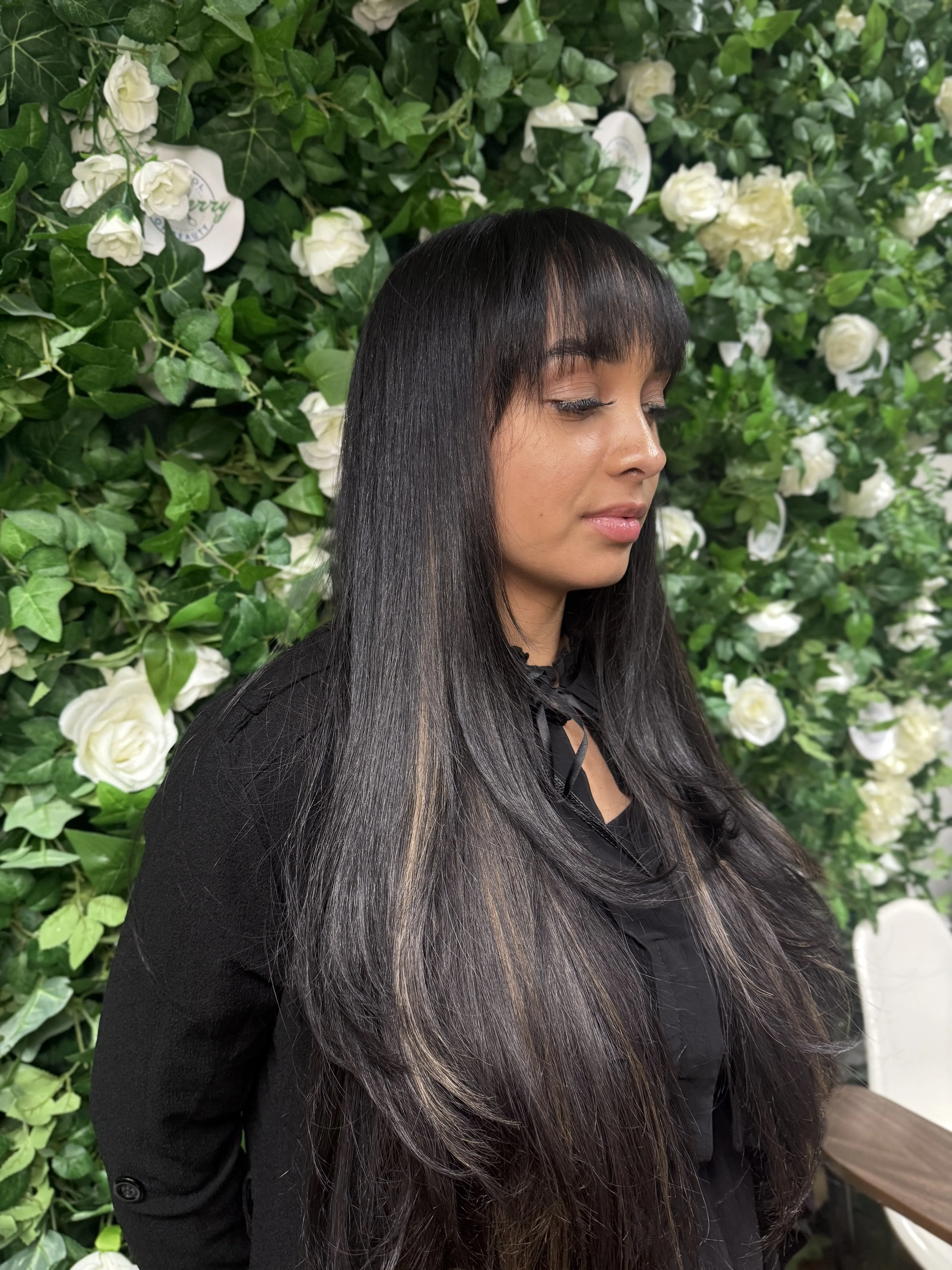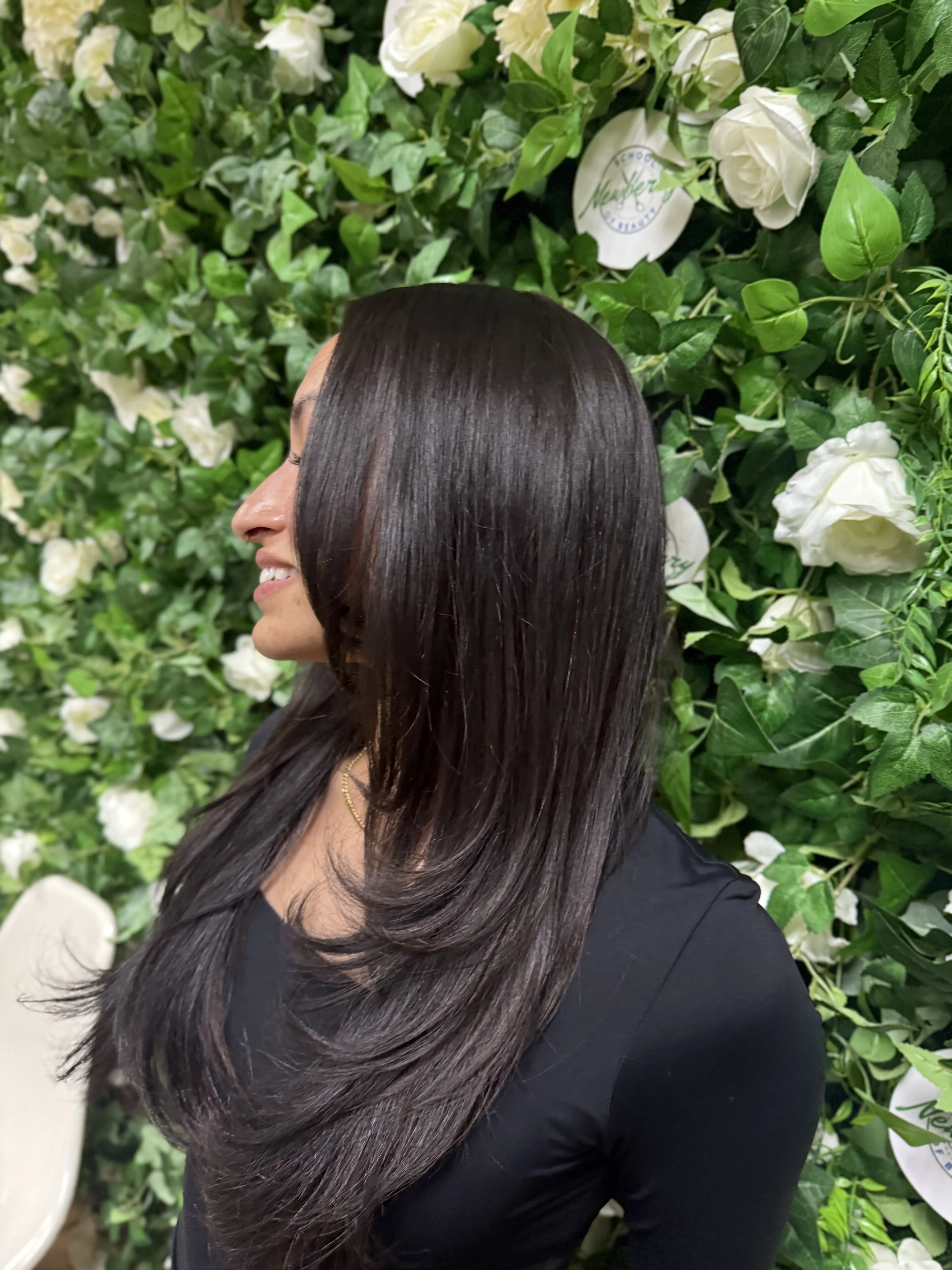 Includes wash, treatment, blow dry, and flat iron for smooth, long-lasting shine. For textured hair, achieved using a silk press technique that enhances gloss and movement. Includes a maintenance trim for healthy ends. (For full reshaping, book the Silk Press + Cut service.)